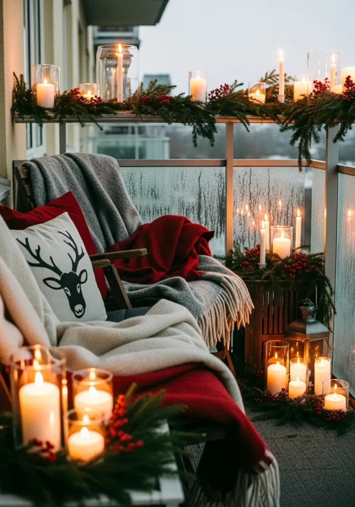 This little balcony feels like a Scandinavian fairytale brought to life. The soft glow of candles fills the space with warmth, reflecting against the frosted glass and creating a magical winter mood. Evergreen garlands with sprigs of red berries run along the railings, adding just the right amount of festive charm. Layered throws in muted grays and deep reds are draped over wooden chairs, inviting you to sit back, wrap up, and enjoy a quiet moment. The reindeer pillow adds a playful Nordic touch that makes everything feel perfectly Christmassy.