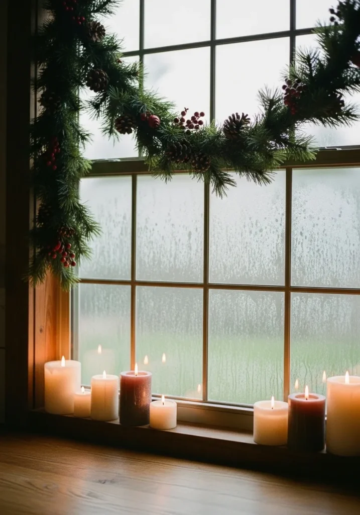 This cozy Scandinavian window scene is the kind of moment that makes you want to slow down and breathe in the season. The wooden window frame adds warmth to the cool, misty glass, while a simple garland of pine, berries, and pinecones drapes gracefully across the top. A cluster of white and cranberry-hued candles flickers softly on the windowsill, creating a glow that feels both intimate and festive. The balance of natural textures and soft light captures that effortless Nordic charm where minimalism meets pure coziness.