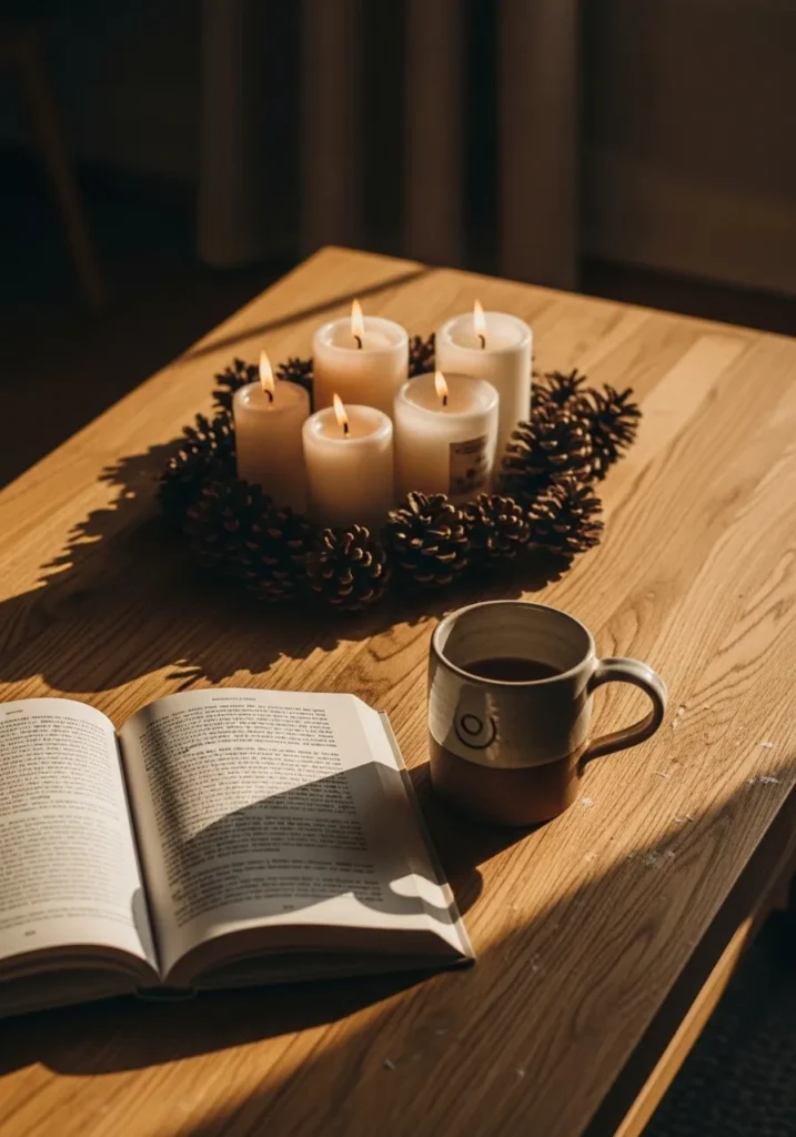 This cozy Scandinavian setup captures everything I love about simple Christmas comfort. A wooden table glows under soft daylight, holding a wreath of pinecones circling thick white candles, their flames flickering gently. An open book and a stoneware mug of coffee complete the serene scene, making it feel like the perfect afternoon escape from winter’s chill. Every element is natural and warm, from the honey-toned wood to the soft light reflecting off the ceramic cup.