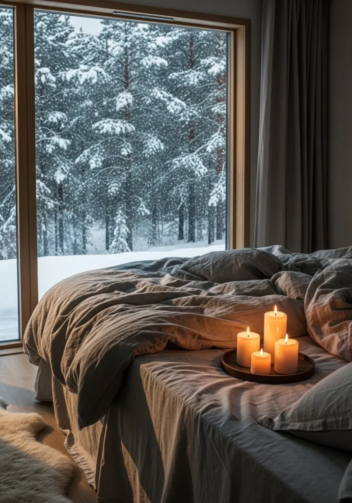 This Scandinavian-style bedroom feels like a quiet winter dream come to life. Soft linen bedding in muted earthy tones drapes casually across the bed, while a small cluster of candles adds a golden flicker of warmth against the cool backdrop of snowy pine trees just outside the window. The clean wooden frame of the large window lets nature take center stage, creating a perfect balance of minimalism and coziness. Every element feels intentionally simple yet deeply comforting, as though time slows the moment you step inside.