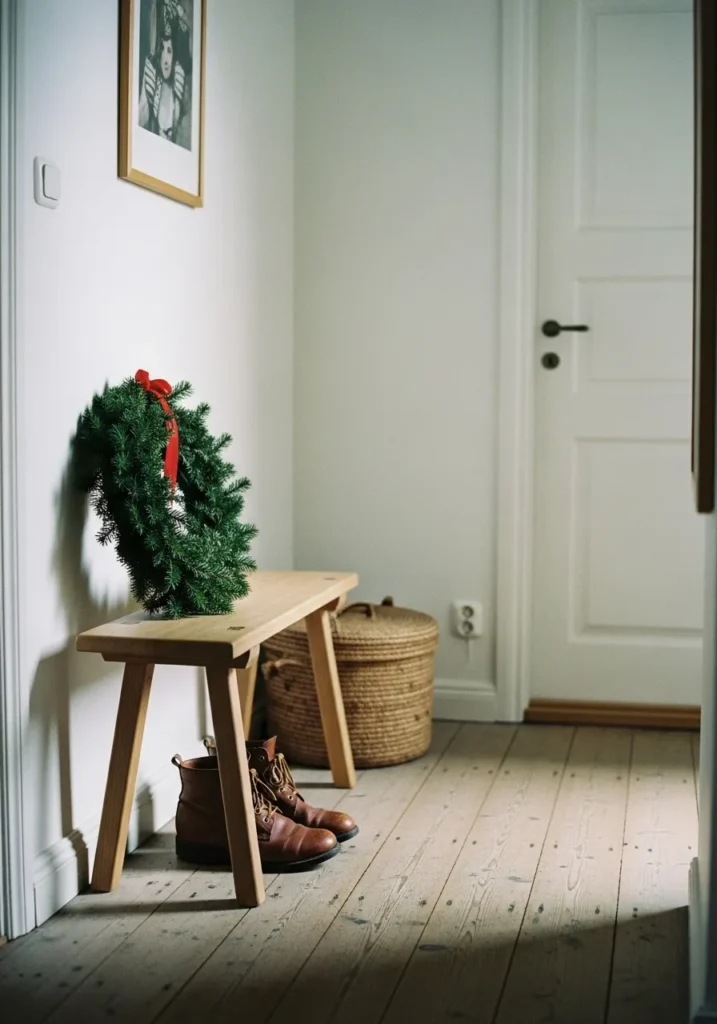 This entryway captures everything I adore about Scandinavian minimalism. The pale wooden floors feel effortlessly warm, the clean white walls bounce the natural light beautifully, and that simple wooden bench brings a sense of calm functionality. A lush green wreath tied with a red ribbon adds just enough festive cheer without overwhelming the space, while the woven basket and sturdy leather boots tucked neatly underneath make it feel lived-in yet intentional.