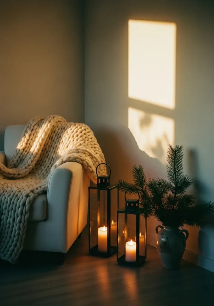 What I adore about this setup is how effortlessly it balances warmth and minimalism. It feels festive without trying too hard, which is exactly the kind of calm energy I crave during the holidays. The combination of soft textures, candlelight, and greenery feels so soothing, like a little pocket of peace on a busy December day. Honestly, if I could, I’d wrap myself in that blanket right now and just watch the candlelight dance on the walls.
