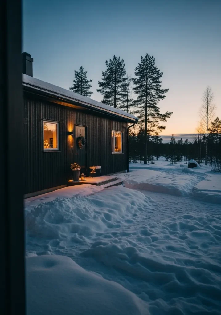 This cozy Scandinavian cabin looks like a postcard come to life. The dark wooden exterior contrasts beautifully against the blanket of fresh snow, while warm amber lights spill from the windows, giving a soft, golden glow that instantly feels welcoming. A simple wreath on the door and a few lanterns placed by the entrance add that understated Nordic charm—minimal, yet full of heart. The tall pine trees in the background and the crisp twilight sky make the whole scene feel calm, pure, and wonderfully festive without even trying too hard.