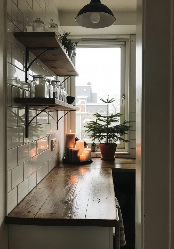 This cozy little Scandinavian kitchen feels like the calm heart of winter. The wooden countertop adds warmth against the crisp white subway tiles, while open shelves lined with glass jars create a clean, minimal look. By the window, a small potted evergreen tree brings a sweet touch of Christmas charm, perfectly paired with a cluster of glowing candles that reflect softly on the tiled wall. The black pendant light above ties the look together with just the right amount of industrial edge.