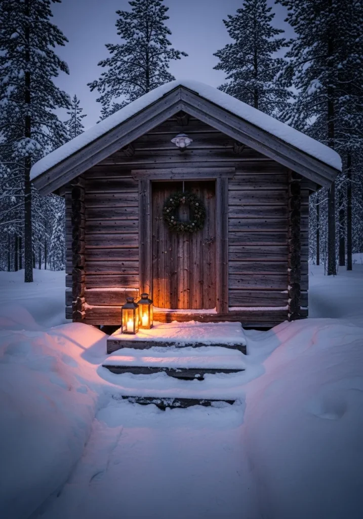 This cozy Scandinavian cabin feels like something out of a Christmas dream. The rustic wooden exterior is softened by thick layers of snow, while two golden lanterns flicker beside the doorway, casting a warm glow that instantly makes you want to step inside. A simple evergreen wreath on the door adds just the right touch of natural holiday charm without overdoing it. The surrounding pine forest, blanketed in snow, makes the whole scene look like the quiet, magical kind of Christmas evening we all secretly wish for.