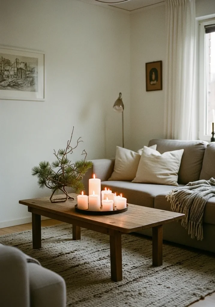 This living room is the perfect example of how Scandinavian design keeps things simple yet impossibly cozy. A soft neutral palette sets the tone, with beige walls, a comfy gray sofa, and textured cushions that invite you to sink in. The wooden coffee table adds an earthy balance, while a cluster of white candles creates that signature Nordic glow. The little pine branch arrangement is such a subtle nod to nature, giving the room a touch of winter charm without feeling cluttered or overdone.
