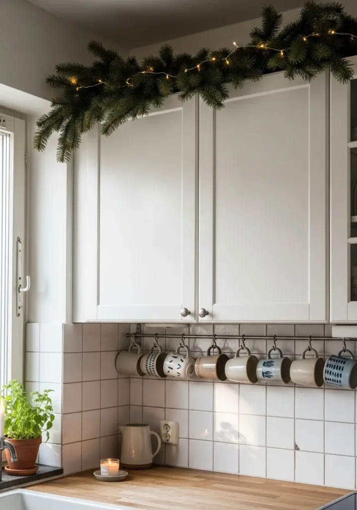 This Scandinavian kitchen captures that perfect balance between function and festive calm. The clean white cabinets, paired with light wood countertops, create a soft, natural base. A string of twinkling fairy lights woven through a lush pine garland above the cupboards adds a subtle touch of Christmas warmth without overwhelming the simplicity of the space. Earthy ceramics and patterned mugs bring just the right amount of personality, while the small potted herb by the window keeps things fresh and homey.
