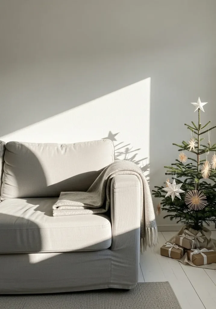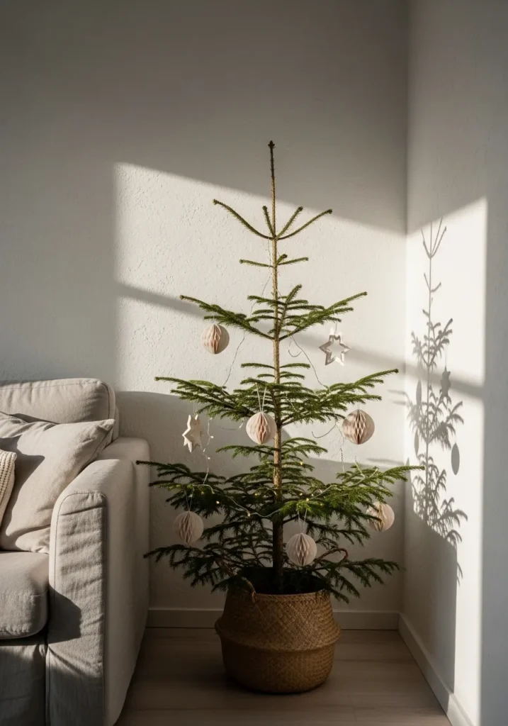 This minimalist Christmas setup feels like a quiet little love letter to Scandinavian simplicity. A small pine tree, potted in a woven basket, stands proudly beside a cozy beige sofa, bathed in soft winter sunlight. The ornaments are delightfully understated—neutral paper baubles and star shapes that add texture without overwhelming the space. The shadows on the wall give the whole scene a poetic calm, making it the perfect example of how less truly can be more during the holidays.