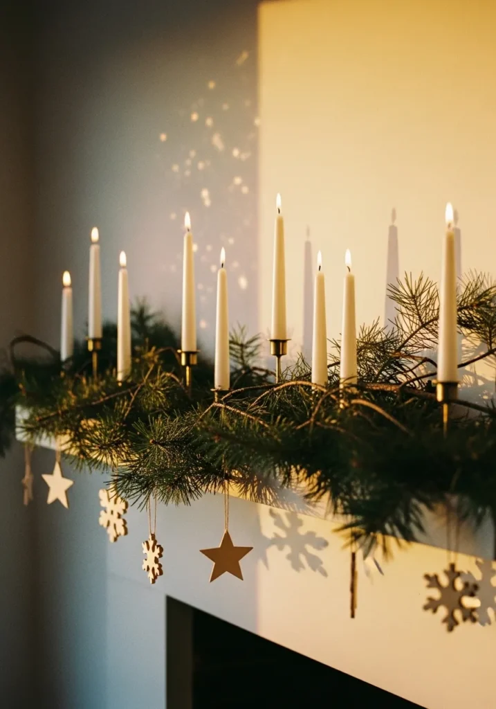 This Scandinavian-style mantel captures everything that’s peaceful and elegant about the season. A simple line of tall white taper candles glows softly against a backdrop of evergreen branches, creating a timeless balance between light and nature. The touch of brass candleholders adds a whisper of warmth, while minimalist wooden ornaments shaped like stars and snowflakes sway gently beneath the greenery. It’s calm, natural, and so effortlessly chic that it almost feels like it arranged itself.
