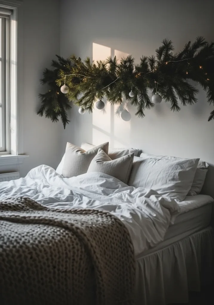 This Scandinavian bedroom feels like the calmest winter morning. The all-white bedding, layered with soft linen and a chunky knit throw, creates that effortless “I just woke up like this” coziness. Above the bed, a lush pine garland trimmed with fairy lights and matte white ornaments adds just the right amount of Christmas spirit without feeling overdone. The sunlight peeking through the window makes the whole space glow in that soft, magical way only Scandinavian interiors seem to pull off.