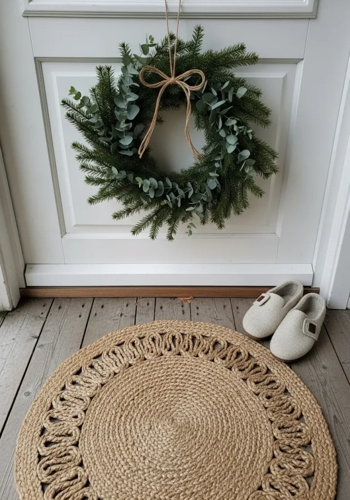 This entryway captures that effortless Scandinavian spirit that makes minimalism feel warm instead of cold. A lush evergreen wreath tied with a simple twine bow hangs against a crisp white door, perfectly balanced by a round woven jute mat underfoot. A pair of soft cream slippers tucked neatly to the side adds that cozy, lived-in touch that makes the whole scene feel like a quiet December morning in a Nordic cottage.