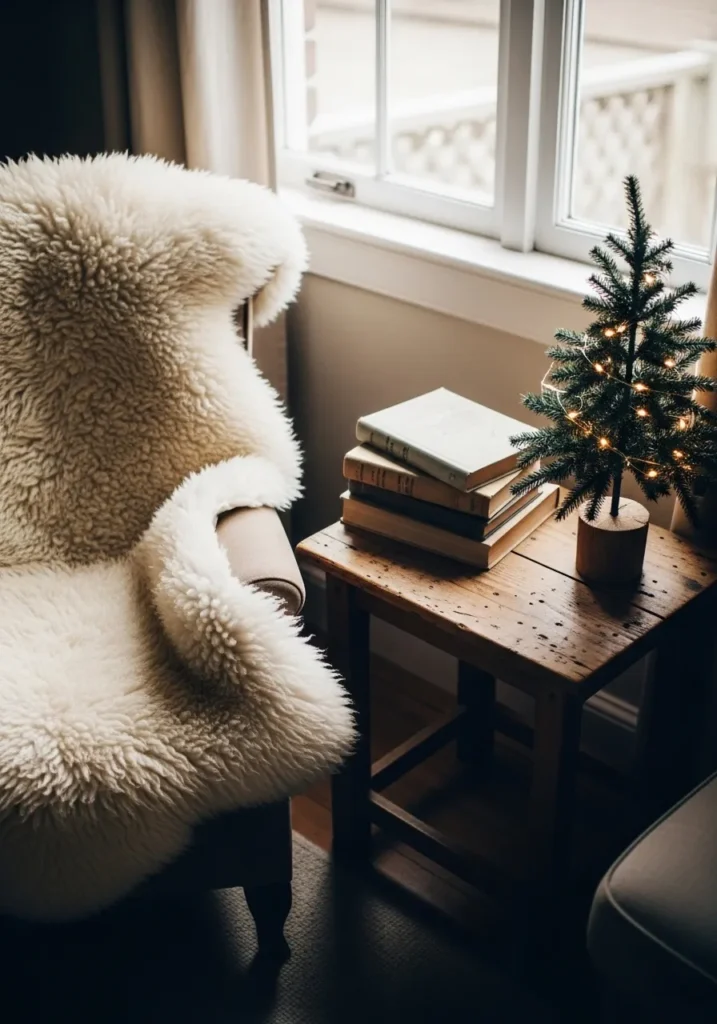 This little corner looks like the definition of calm Christmas charm. A soft, creamy sheepskin casually draped over a comfy armchair creates the perfect spot for a slow morning or a late-night read. The rustic wooden side table adds that cozy, imperfect texture Scandinavian homes are famous for, while the mini Christmas tree with warm fairy lights brings just the right touch of festive sparkle. A few well-loved books stacked nearby complete the picture of slow living at its best.