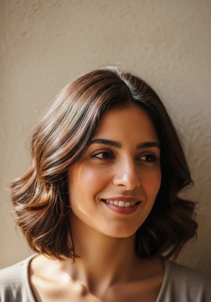This softly curled bob has a natural bounce that feels chic and effortless. The warm brown tones add richness, while the gentle waves create volume and texture. It’s the perfect mix of refined and relaxed, ideal for any celebration.