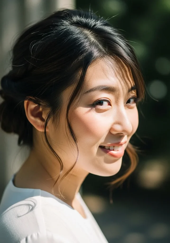 Long, glossy hair is pulled halfway back and secured with a navy ribbon, letting the rest flow freely down the back. The light catches the strands beautifully, creating a soft halo effect. It’s sweet, classic, and a little bit nostalgic in the best way.