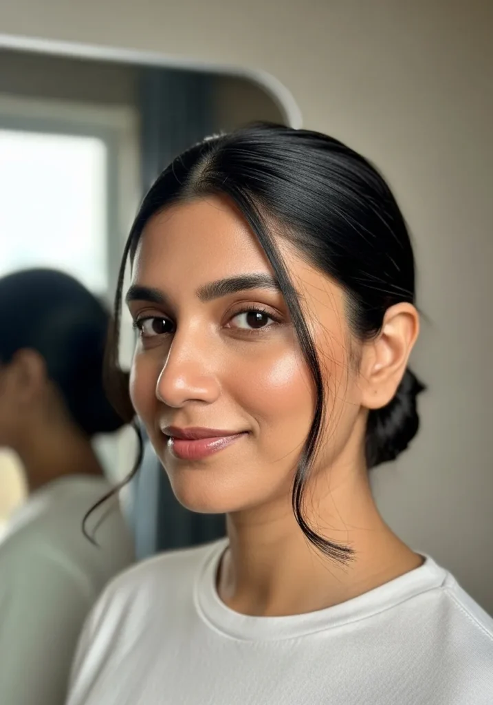 This sleek bun sits low and smooth at the nape, with a clean side part that frames the face perfectly. Every strand is tucked into place, and a few delicate pieces fall softly for a romantic finish. It’s polished, minimal, and full of old-school elegance.