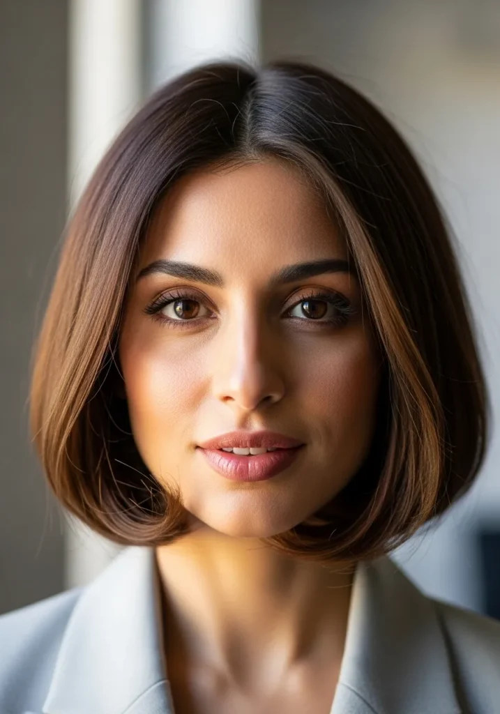 This hairstyle is pure simplicity done right. The hair is cut just below the chin, creating a neat bob with a sleek, middle part that frames the face evenly. It’s glossy, straight, and effortlessly modern while still giving off that timeless sophistication.