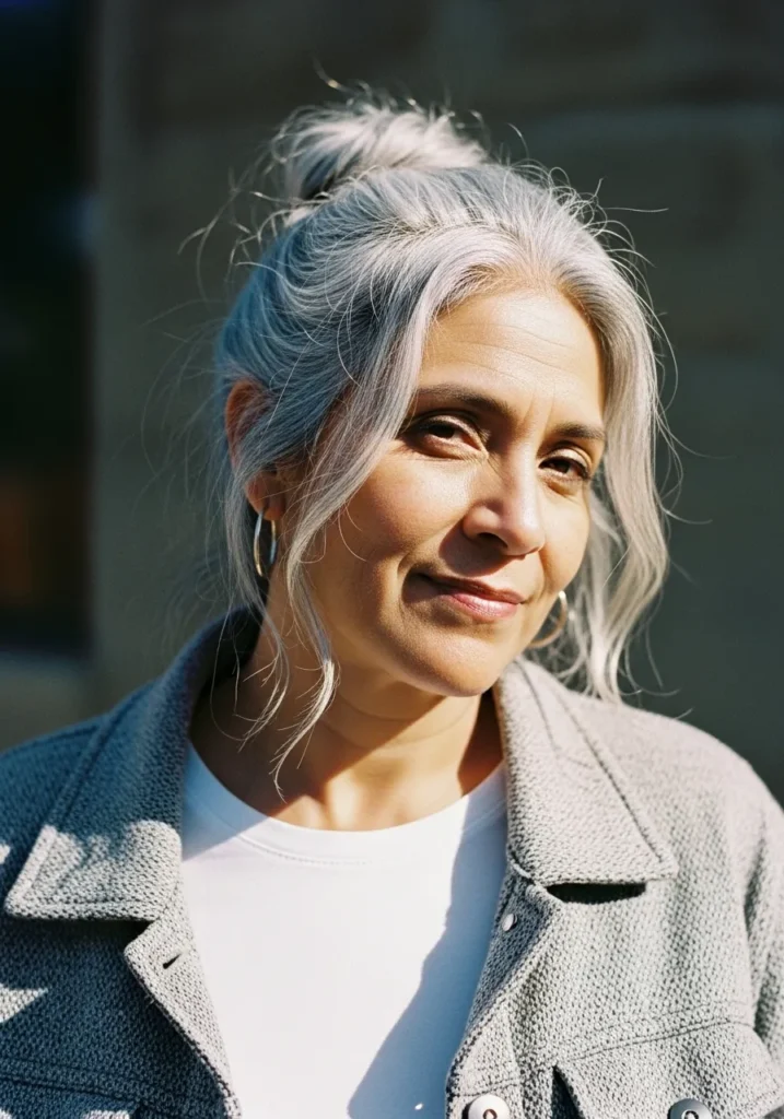 This effortlessly chic top knot features silver hair pulled into a soft bun with a few wispy strands left loose around the face. It’s casual but still elegant, striking the perfect balance between relaxed and refined.