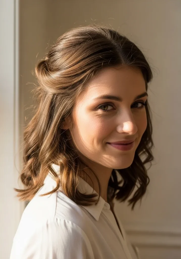 This half-up hairstyle is full of gentle curls and volume, with the top section pinned back to create a soft lift. The texture is natural and bouncy, catching the light with every turn. It’s feminine, graceful, and effortlessly timeless.