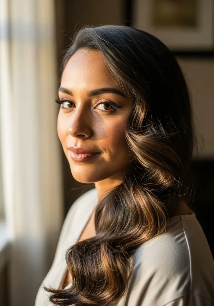This hairstyle features voluminous side-swept waves with soft golden highlights that reflect the light beautifully. The curls are loose but structured, creating that glamorous, movie-star kind of look that never fades out of style.