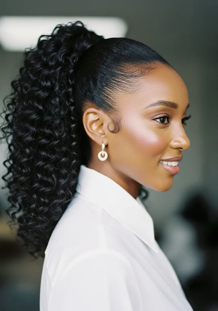 Tight, glossy curls are pulled high into a ponytail that’s full of bounce and energy. The base is sleek and smooth, highlighting the contrast between the soft curls and polished roots. It’s bold, confident, and full of personality.
