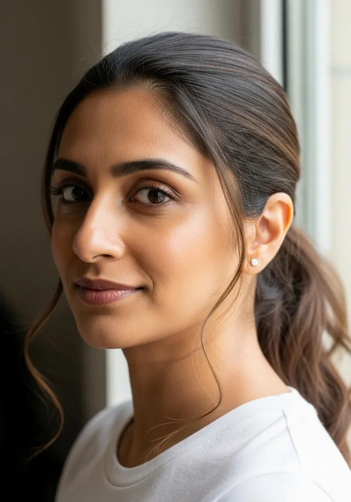 The hair is gathered into a smooth low ponytail with subtle shine and a few delicate face-framing strands. It’s minimal, sleek, and endlessly chic. The texture is silky and refined, keeping the overall look fresh and polished.