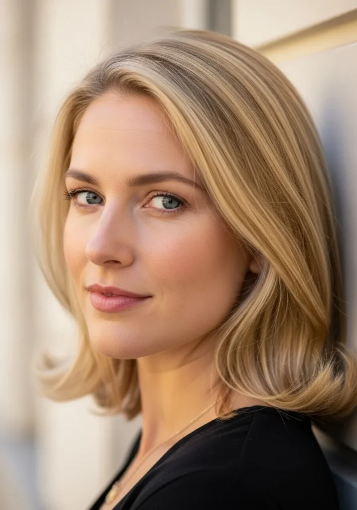This shoulder-length cut features smooth, softly flipped ends that give a gentle lift. The style has a subtle golden-blonde hue that catches the light perfectly, making it look fresh and timeless. It’s simple, elegant, and full of healthy shine.