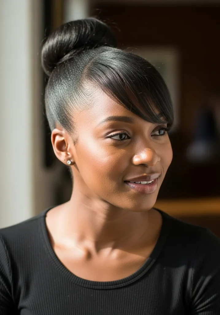 This look is all about clean lines and soft balance. The hair is gathered into a smooth, high bun that sits neatly at the crown, while the front features side-swept bangs that frame the face in the most flattering way. The finish is glossy and polished, giving it that effortless red-carpet charm.