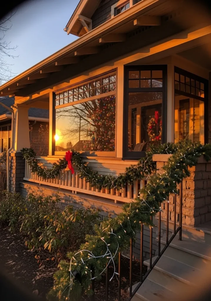 This charming Craftsman-style porch glows under the warm sunset, showing off a perfect mix of classic architecture and festive cheer. The railings are wrapped in lush green garlands sprinkled with fairy lights and finished with a simple red bow, creating that effortless “just enough sparkle” look. Inside, a glittering Christmas tree peeks through the window, adding a cozy hint of color that perfectly complements the golden light spilling across the porch.