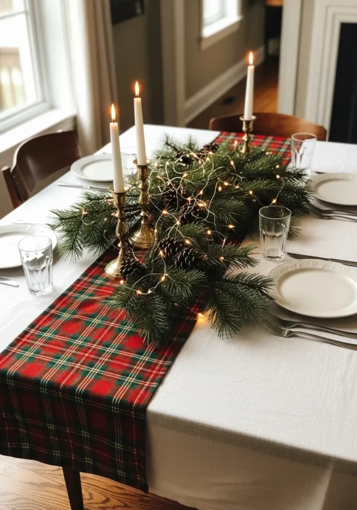 This cozy Christmas table setup blends timeless charm with festive cheer. A red and green tartan runner stretches across a crisp white tablecloth, setting the perfect base for a natural pine garland sprinkled with pinecones and tiny twinkling fairy lights. Brass candlesticks with tall white candles add a warm, flickering glow that makes the whole room feel instantly magical. The simple white dinnerware and clear glassware keep the look elegant and uncluttered, allowing the centerpiece to truly shine.