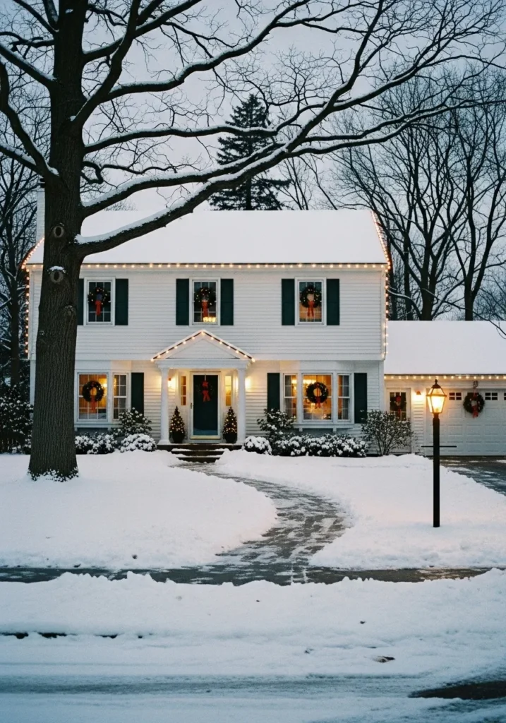 This timeless Colonial-style home looks like it was plucked straight from a holiday movie. The clean white siding contrasts beautifully with the dark shutters, while matching wreaths tied with bright red ribbons add a perfect touch of festive balance to every window. Twinkling string lights trace the roofline and entryway, and the soft glow from the lamppost reflects off the snowy pathway, guiding you right to the front door. Everything about this scene whispers cozy family traditions, warm cocoa, and the sound of carols drifting through frosted windows.