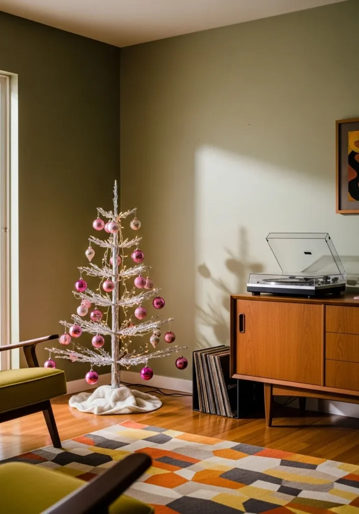 This room feels like a nostalgic Christmas postcard from the 70s in the best way possible. The olive-green walls, mid-century wooden cabinet, and geometric rug bring that perfect retro warmth. The minimalist silver tinsel tree decorated with pink ornaments adds just the right touch of sparkle without taking over the space. The soft sunlight streaming across the floor and the little record player tucked in the corner make it feel cozy, relaxed, and totally stylish.