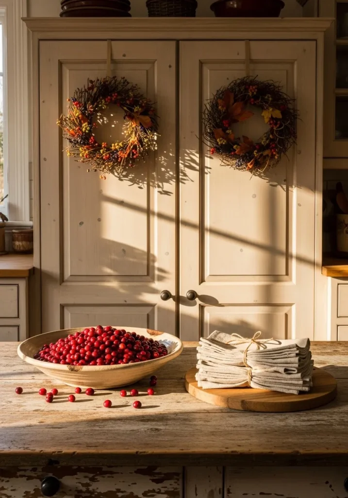 This cozy farmhouse kitchen feels straight out of a nostalgic Christmas postcard. The soft afternoon light falls gently over cream cabinets, two berry-filled wreaths, and a rustic wooden table that’s seen plenty of family gatherings. A big ceramic bowl brimming with fresh cranberries steals the spotlight, adding a pop of festive red against the warm neutral tones. Stacked linen napkins tied with twine sit neatly beside it, ready for a home-cooked holiday meal. It’s simple, organic, and so effortlessly beautiful.