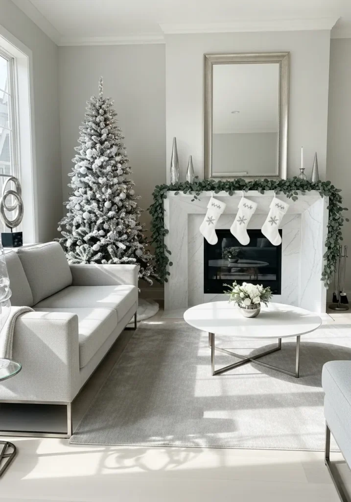 This living room is the definition of winter elegance. Everything here whispers calm sophistication, from the frosted Christmas tree dressed in soft silver ornaments to the crisp white stockings neatly hanging above the marble fireplace. The silvery garland adds just enough greenery to keep things festive without breaking the serene monochrome palette. Light gray sofas, a sleek white coffee table, and sunlight streaming through the windows make the whole space glow with understated warmth.