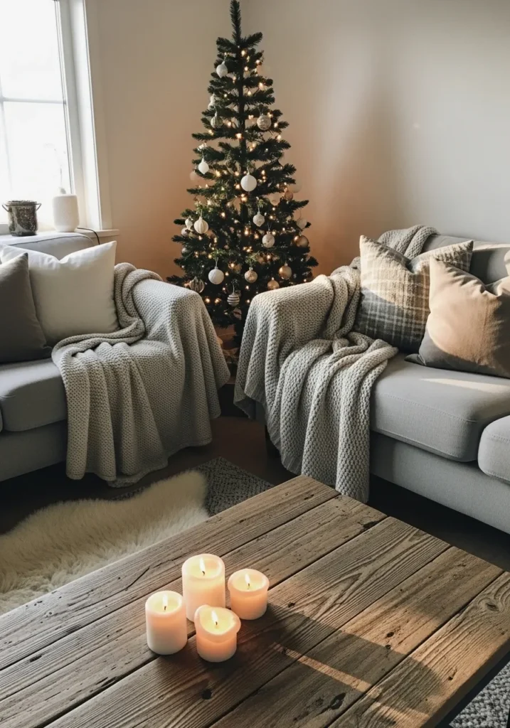 This cozy living room captures the art of understated holiday beauty. Soft gray sofas are wrapped in chunky knit throws, perfectly mirroring the calm, neutral palette of the space. A modest Christmas tree sparkles quietly in the corner, adorned with delicate golden and white ornaments that twinkle under the soft glow of warm lights. The rustic wooden coffee table, topped with simple pillar candles, adds just the right touch of natural charm, creating a space that feels both modern and inviting.