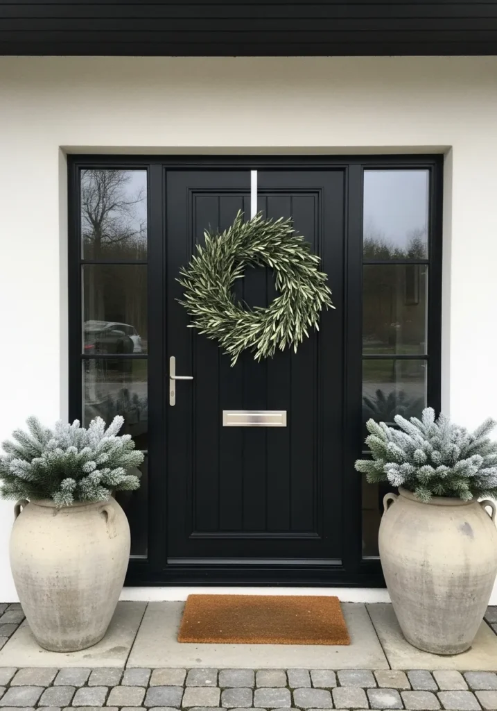 This front door setup is the perfect example of how simplicity can still feel festive. The matte black door creates a striking contrast against the white walls, while the lush green wreath adds just the right touch of holiday cheer without being over the top. The twin ceramic planters with frosted greenery give off subtle winter vibes, and the warm brown doormat ties it all together with a cozy welcome. It’s clean, minimal, and effortlessly stylish—the kind of design that makes neighbors stop and take notes.