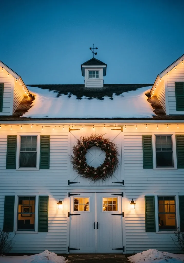 This cozy white farmhouse looks straight out of a holiday card with its green shutters, snow-kissed roof, and a giant natural wreath stealing the spotlight above the barn-style doors. The warm golden glow from the window lanterns and the string lights tracing the roofline create that storybook charm everyone secretly dreams of in December. It’s simple, traditional, and utterly timeless, proving that you don’t need over-the-top decorations to make a stunning festive statement.