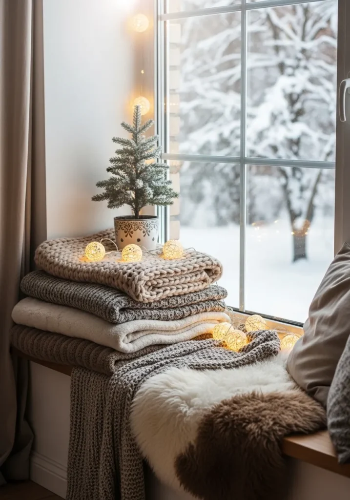 This design captures the ultimate winter comfort vibe with a window nook that feels straight out of a snow-day dream. A tiny potted evergreen tree adds a festive touch while chunky knit throws and neutral-toned blankets are stacked neatly for that inviting, layered look. The soft glow from string lights reflects gently on the glass, creating a magical contrast against the snowy outdoor view. Everything about this corner whispers warmth, softness, and the kind of calm only a cozy blanket can bring.