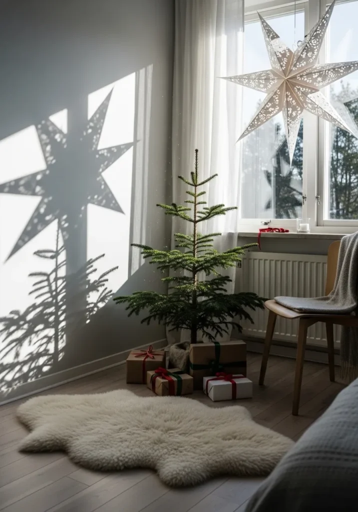 This airy Christmas setup captures the beauty of Scandinavian simplicity. A small evergreen stands proudly by the window, its natural shape untouched by heavy ornaments. Soft sunlight pours through sheer curtains, casting a dreamy star-shaped shadow on the wall from the delicate paper lantern above. Wrapped gifts in muted tones rest neatly beneath the tree, while a cozy faux fur rug adds a touch of warmth to the pale wooden floor. Every element whispers calm and understated cheer.