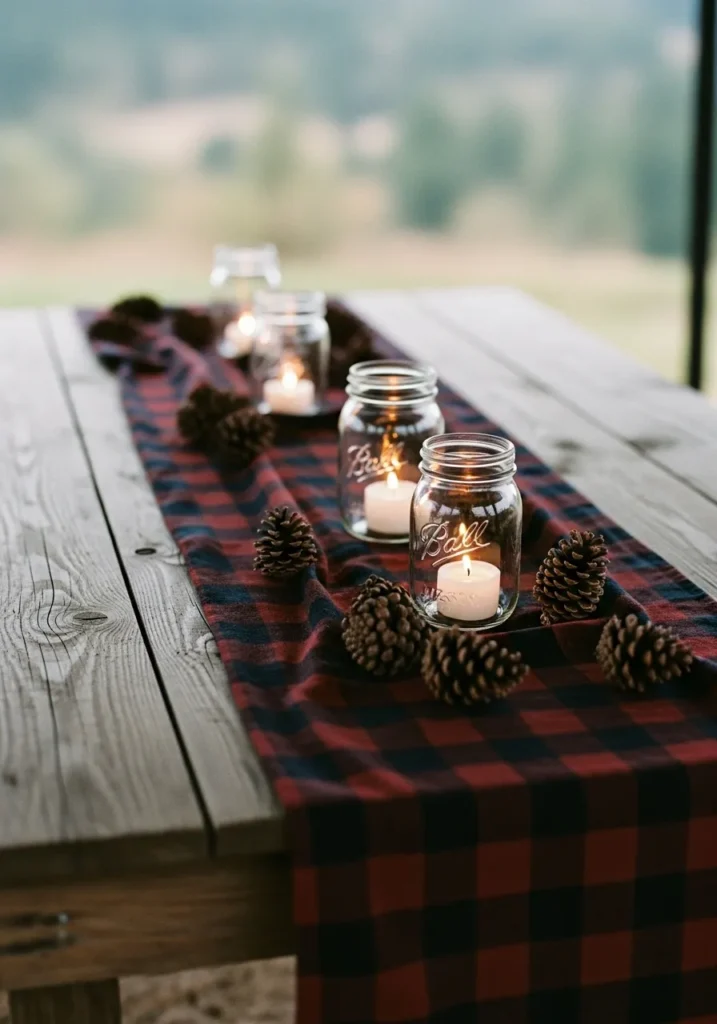 This rustic table setup feels like a warm hug on a snowy December evening. A red and black plaid runner stretches across a weathered wooden table, topped with simple mason jars holding flickering tea lights. Pinecones scattered around add that effortless woodland charm, making the whole setting smell faintly of pine and nostalgia. It’s the kind of design that makes even an outdoor dinner feel like a cozy family gathering in a mountain lodge.