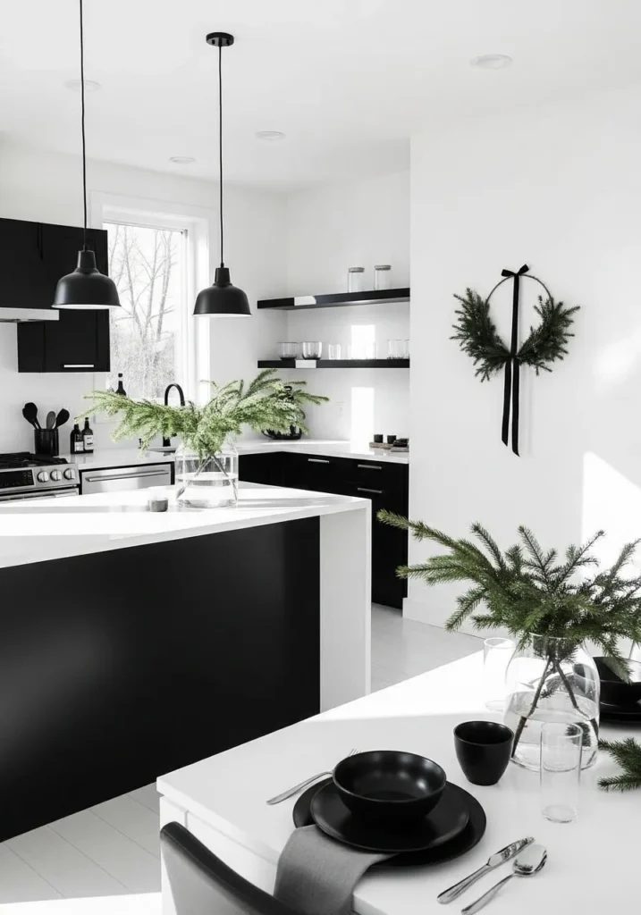This kitchen is what happens when Scandinavian minimalism meets Christmas chic. The crisp white walls and sleek black cabinetry create a striking monochrome base, while a few carefully placed pine branches and a delicate wreath add that subtle festive magic. The clean lines, modern lighting, and uncluttered countertops make everything feel calm and intentional, like the kind of space where every detail matters. It’s proof that holiday decor doesn’t always need to sparkle to shine—sometimes it’s all about restraint and balance.