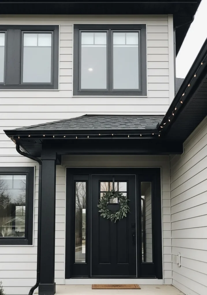 This modern black and white entryway is the perfect example of minimalist sophistication meeting holiday warmth. The crisp white siding contrasts beautifully with the deep matte black trim and front door, giving the home a clean and timeless look. The simple greenery wreath adds just the right amount of festive charm, while the subtle string lights along the roofline bring a soft, welcoming glow without overpowering the sleek design. It’s effortlessly chic, the kind of house that makes neighbors slow down as they pass by.