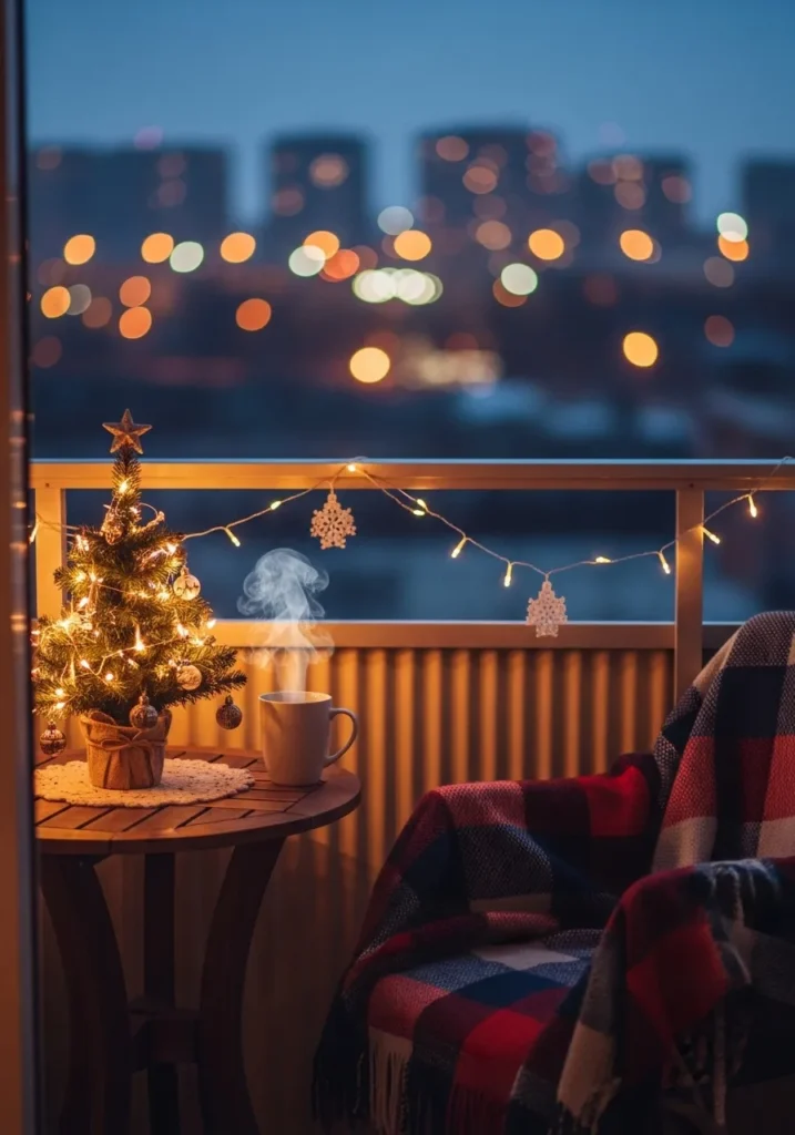 This cozy little balcony setup turns a small outdoor space into the sweetest Christmas retreat. A mini tree dressed in warm fairy lights sits beside a steaming mug on a wooden table, while delicate snowflake lights twinkle along the railing. The city lights softly blur in the background, creating that dreamy mix of urban energy and festive calm. A plaid blanket draped over the chair makes it the perfect spot to curl up and watch the night sparkle.