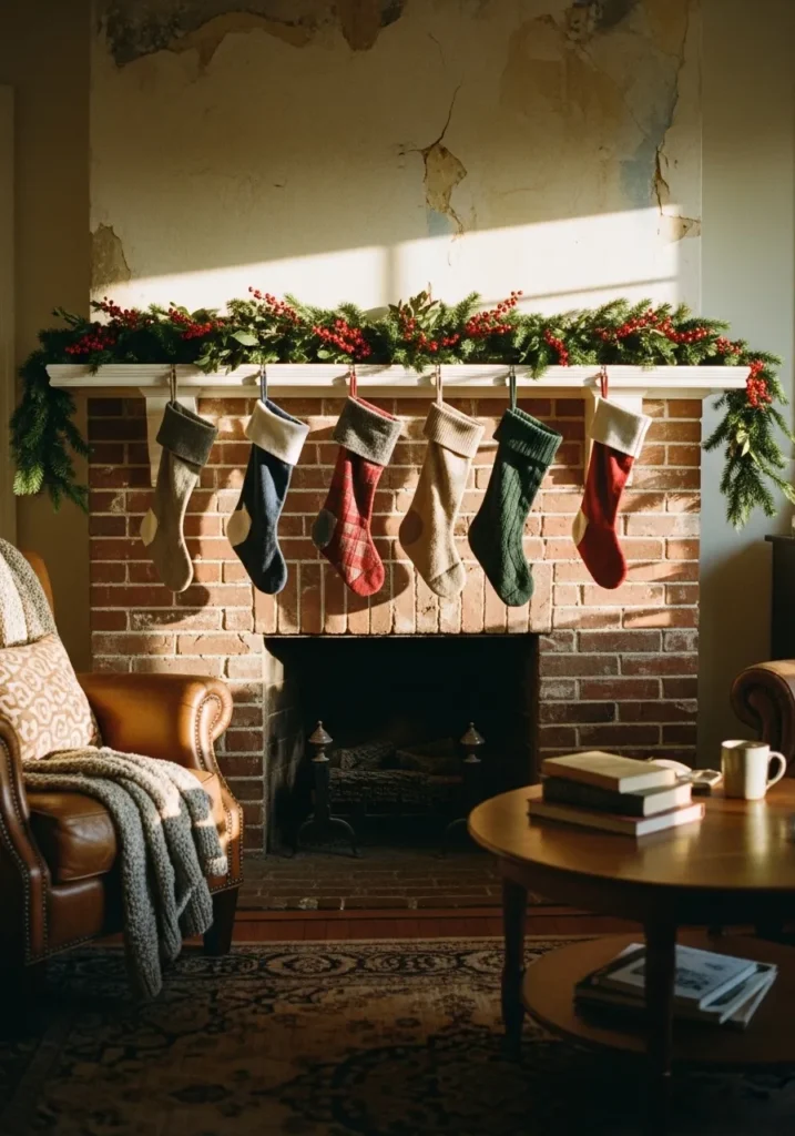 This cozy brick fireplace setup brings that timeless Christmas charm that never goes out of style. The stockings in mixed textures and colors look perfectly imperfect, giving the space such a lived-in, heartwarming feel. A garland of fresh greenery dotted with red berries drapes across the mantel, adding a touch of nature’s beauty against the rustic brickwork. The sunlight streaming across the wall creates that golden-hour glow that makes everything look extra nostalgic and welcoming.