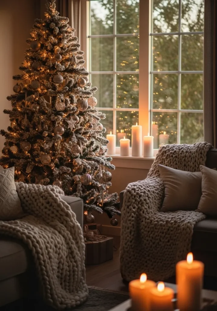 This living room feels like a soft hug in December form. The snowy Christmas tree, dusted with delicate frost and shimmering ornaments, takes center stage beside a large window that reflects the warm flicker of candlelight. Cozy knit blankets in creamy tones spill over plush armchairs, and the glow from the candles gives the whole space that golden, peaceful hush that only happens right before Christmas Eve. Everything here whispers warmth, comfort, and just a touch of winter magic.