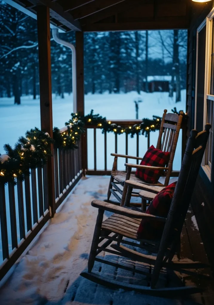 This snowy porch setup feels straight out of a winter postcard. The rustic wooden rocking chairs are perfectly paired with red-and-black plaid pillows that add just the right pop of color against the snowy backdrop. Twinkling string lights woven through the evergreen garland along the railing create a soft, golden glow that makes the cold evening feel warm and inviting. It’s simple, timeless, and radiates that old-fashioned Christmas charm we all secretly dream about.
