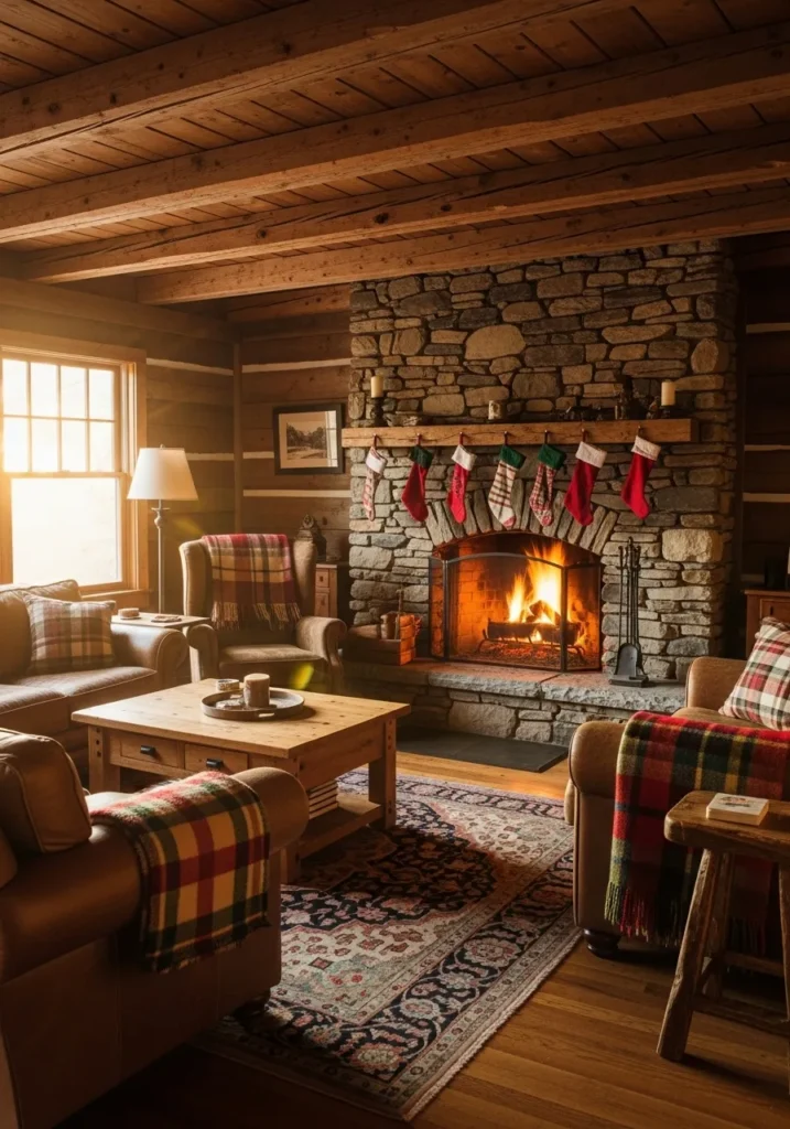 This cozy log cabin living room feels like it was made for Christmas mornings. The stone fireplace is the star of the show, framed by wooden beams and glowing with the soft light of a crackling fire. Classic red and green stockings hang neatly across the mantel, while warm plaid throws and cushions invite you to sink right in. The natural textures of leather, wood, and stone create a layered warmth that feels both timeless and authentic.