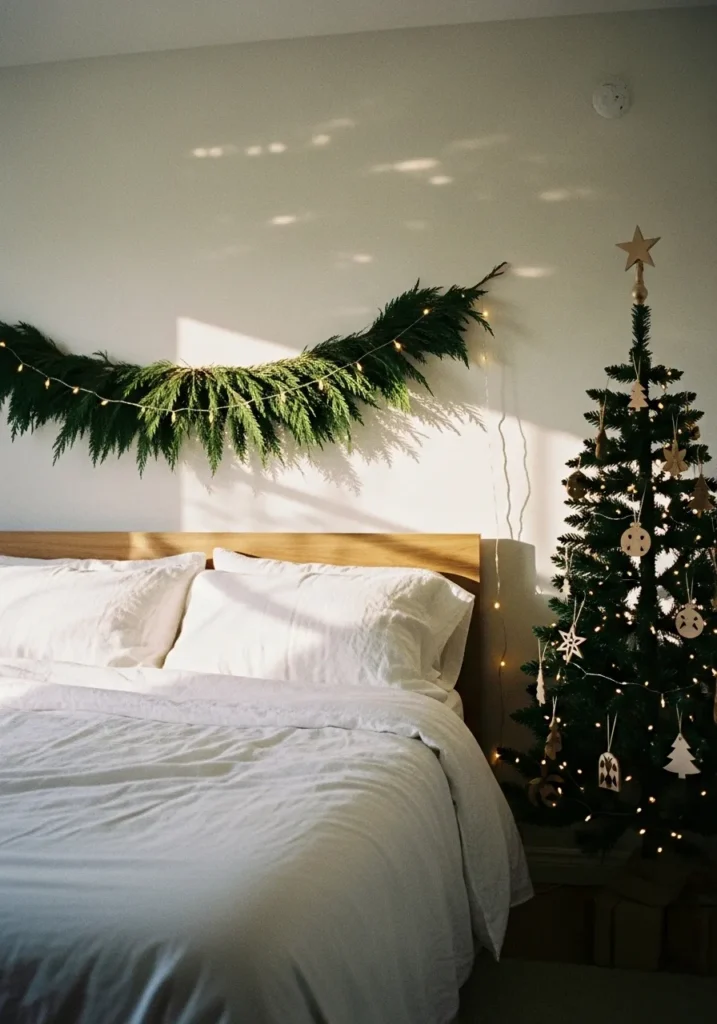 This minimalist Christmas bedroom feels like a quiet little retreat wrapped in soft morning light. A simple garland of evergreens drapes above the bed, paired with twinkling fairy lights that catch the sunlight just right. The small Christmas tree tucked in the corner is decorated with natural wood ornaments and a few golden stars, perfectly matching the clean white bedding and pale walls. Everything feels calm, uncluttered, and effortlessly festive.