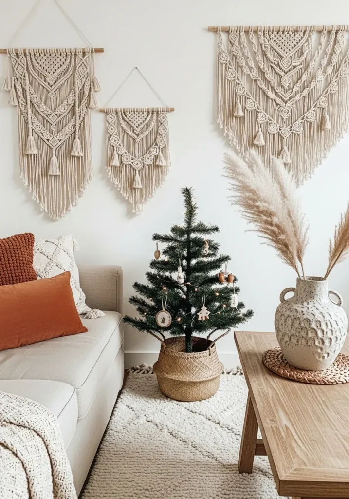 This cozy little nook gives Christmas a fresh bohemian twist with its warm neutral tones and handcrafted textures. The mini tree is tucked neatly into a woven basket, dressed with simple wooden ornaments and soft fairy lights that add just the right touch of sparkle. On the wall, layered macramé hangings steal the show with their intricate knots, while pampas grass in a rustic vase brings that soft, organic touch every boho lover dreams of. The mix of creamy textiles, chunky knits, and natural woods creates a calm, grounded space that still feels festive and full of charm.