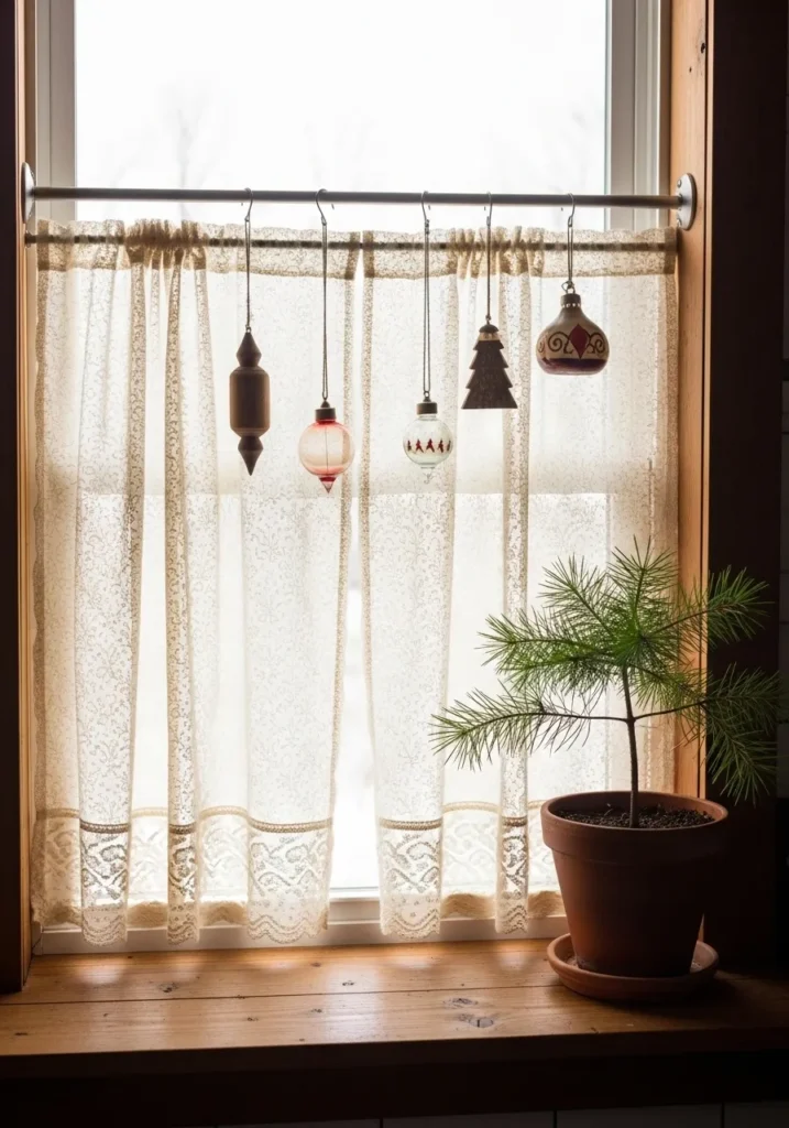 This cozy little window scene feels straight out of a nostalgic holiday postcard. Sheer lace curtains filter in soft winter light, while a row of mismatched vintage ornaments dangle delicately from the curtain rod. Each ornament tells its own story through warm tones of gold, red, and wood, giving that perfect mix of charm and simplicity. The terracotta pot with a small pine adds just enough greenery to complete this effortlessly lovely setup.