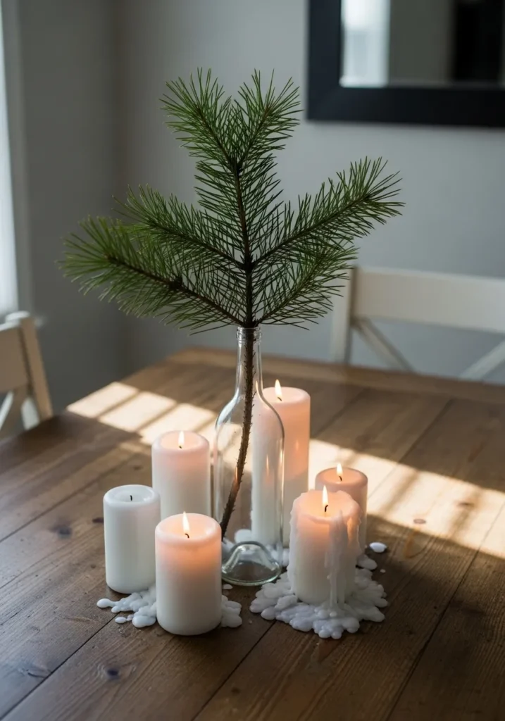 This cozy little setup proves that minimalism can still feel incredibly festive. A single pine branch in a clear glass bottle creates a fresh, natural centerpiece, while clusters of white pillar candles bring that soft, flickering magic we all crave at Christmas. The melted wax pooling at the base adds a perfectly imperfect touch that makes the whole scene feel lived-in and real. It’s the kind of setup that feels peaceful, like a quiet December morning with coffee and carols humming in the background.